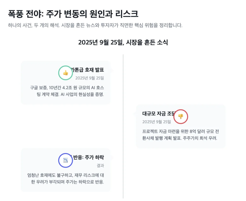 - 주주가치 희석 리스크: 구글에 부여된 워런트, 대규모 전환사채, 그리고 앞으로도 계속될지 모르는 추가 자금 조달은 기존 주주들의 지분 가치를 지속적으로 희석시킬 명백한 위험 요소입니다.